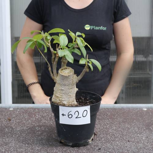 Areas of origin: Africa, from the Sahel to the Transvaal, in the dry savannah regions. Keeping a Baobab Tree inside: Put in a warm environment (minimum temperature 12°C) and well lit near a window. In some areas it will be possible to put outside from June throughout to September.Water thoroughly when the compost is dry. Can wait for another month before being watered again. Continue watering even if the tree loses its leaves in winter. You can treat your Baobab Tree like a house plant and transplant later into bigger containers, or pots with a water reserve. The baobab should be re-potted every 2 years: - Trim roots by a third.- Choose a terracotta pot with a hole, one size bigger than the root ball. - Fill with a mix of compost (70%) and sand (30%). - Re-pot and water well. Each Baobab tree is unique and has its own number. The tree that you select on the photographs above, matches the one ordered. Discover our special offer of the moment and choose yours. Characteristics and Uses: The baobab is one of the most useful trees grown in the Sahel. It is revered and protected by the population. A source of shade and landmark in the countryside, the Baobab is treated as a meeting point for markets and other events. The leaves are rich in calcium, iron, proteins and lipids, constituting an additional source of nutrition. The fruit is commonly known as monkey bread. The pulp is used for making refreshing drinks rich in Vitamins B1 and C. Young shoots and roots are eaten like asparagus. The black seeds contained in the pulp can be grilled and eaten. They contain more protein than peanuts and have a higher percentage of Lysine (amino acids necessary for growth) than in vegetables. At the time of the sap rising, the bark fibres are taken off up to 1.5m (4.9') in length and on the entire circumference of the trunk to make ropes. The wood being very soft and spongy is not used. It has high water content, up to 10,000 litres in large trees. In drought periods, humans and animals will chew the wood to appease their thirst. The old trees often have natural or man-made cavities that act as water reservoirs, or food and cereals stocks. They can also act as refuges or burial sites. The baobab has a very high resistance to fire and drought. It has very few enemies: - Young trees are usually only destroyed by fire or animals,- the biggest ones can be damaged by elephants who break the branches, - the oldest ones are either destroyed by storms, lightning or just collapse. www.planfor.co.uk