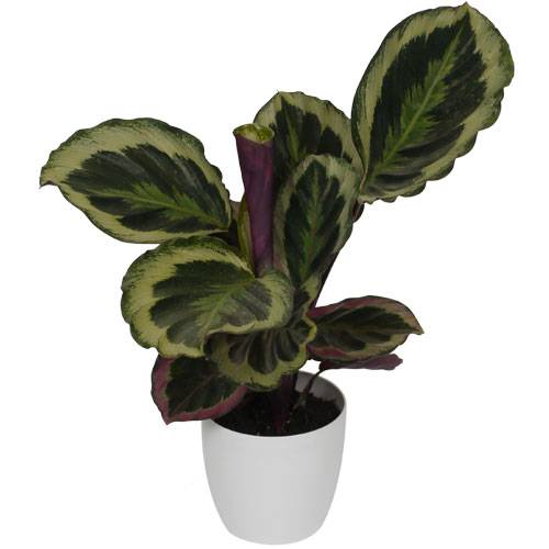 The Calathea 'Shinestar' has highly decorative shiny foliage. Its large rounded leaves are green with cream margins and purple undersides.