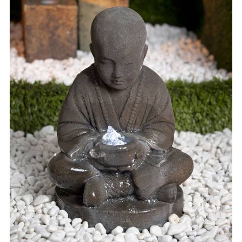 Garden Fountain Semarang: Fountain with LED lighting at bowl level which represents a meditating Buddha. It is made of only one piece, with Buddha sitting on its base.Material: Polyresin Dimensions: 30 x 25 x H.47 cm Kit: Complete set, ready to use including:- A pump to connect to the mains (flow: 600 litres/hour) - A basin of 90 litres (Ø 68 x H. 36 cm) - A covering plate (to place the fountain on the basin) - LED lighting - All the necessary connecting material www.planfor.co.uk